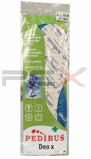 Deo talpbetét vászon felsőrészből, antibakteriális latex alsó-részből készült. Perforációin keresztül jól szellőzik, ezáltal a cipőben a láb kevésbé izzad, frissességet nyújt egész napra. Speciális hatóanyaga megakadályozza a gombásodásért és lábszagért felelős baktériumok elterjedését. Puhasága csökkenti a bőrkeményedés kialakulását és tehermentesíti