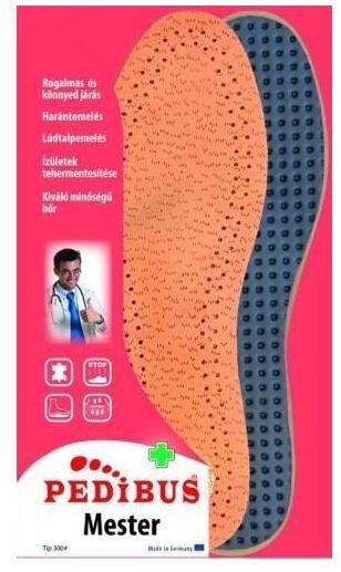 A Pedibus 3004 Mester harántemelő lúdtalpbetét valódi bőr felsőrészből és rugalmas aktív szenes alsó részből készült. 1 pár harántemelő lúdtalpbetét; Pedibus termék lúdtalp kezeléséhez.