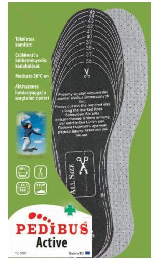 Vászon felsőrészből és aktív szén alsó részből készült. Perforációin keresztül jól szellőzik, ezáltal a cipőben a láb kevésbé izzad. 1 pár talpbetét; Pedibus termék az egész napos komfortért és higiéniáért.
