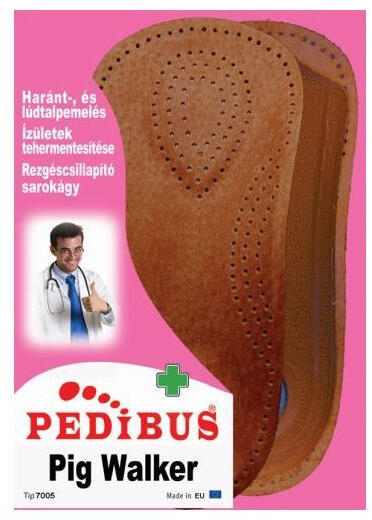 3/4-es sertésbőr gyógytalpbetét, haránt-, és lúdtalpemeléssel, rugalmas sarokággyal. 1 pár 3/4-es gyógytalpbetét; Pedibus termék 3/4-es sertésbőr gyógytalpbetét.