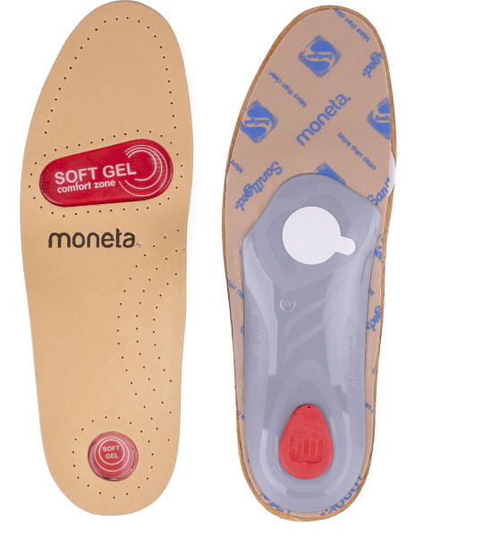 Kellemes perforált birka bőrből készült ortopéd talpbetét, latex hab réteggel, aktív szénnel és gélpárnákkal a sarok és a láb elülső ujj része alatt, melyek minden lépésnél puha felületet és kellemes érzést biztosítanak. A talpbetét formatervezett műanyag kialakítása csökkenti a láb terhelését és deformációját, és egyúttal megtámasztja a láb keresztirány