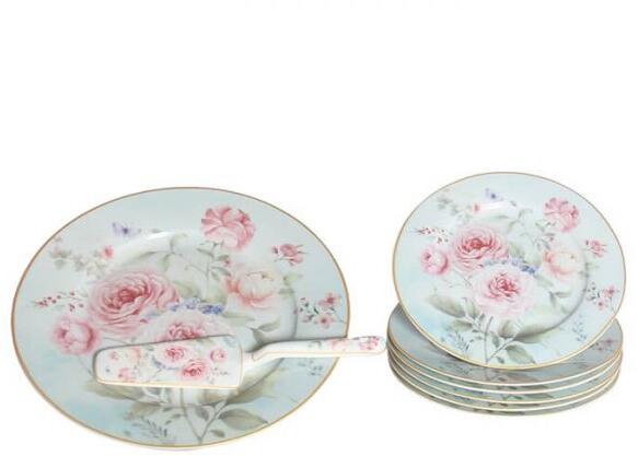 Egy születésnapi parti, esküvő vagy akár házassági évforduló nem nélkülözhet egy gyönyörű tortát. Ezekre a ritka alkalmakra, vagy családi összejövetelekre ajánljuk ezt a 6 személyes süteményes készletet. Ez a szép rózsás porcelán süteményes készlet tökéletes választás elegáns tálaláshoz és különleges alkalmakra. A készlet 6 személyes, és tartalmaz 6 dara