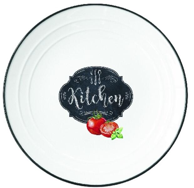 Zománcozott tányér világoskék vonallal, átmérő 24 cm.