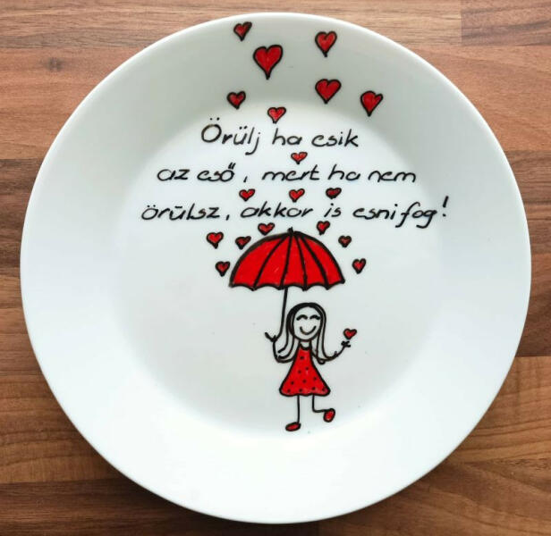"Örülj ha esik kistányér, 20 cm átmérő Aranos, idézetes kistányér, bögrével is kérhető Egyedi elképzelést is szívesen megvalósítok, a névre, feliratra mintára vonatkozó kéréseidet a megjegyzés rovatban tudod feltüntetni. A termék egészségre ártalmatlan porcelán festékkel készült, 50 fokig mosogatógép álló. A tányérhoz tányér tartó is rendelhető , amennyi