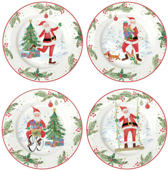 Joyful Santa porcelán desszerttányér szett 4 db-os, 19 cm – Díszdobozban Várd a karácsonyt vidám hangulatban ezzel a csodálatos Joyful Santa porcelán desszerttányér szettel , amely négy darab, 19 cm átmérőjű porcelán tányért tartalmaz. A desszerttányérok finoman kidolgozott karácsonyi motívumokkal díszítettek, melyeken a Mikulás különböző, mókás jelenetekben tűni