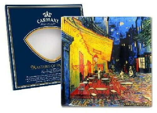 Kisméretű üvegtányér Van Gogh: Kávéház éjjel című festményével díszítve. Mérete 13x13 cm. Ajánljuk pohár alátétnek, gyertya alátétnek. Vincent van Gogh (1853-1890) holland festőművész, a posztimpresszionizmus egyik legnagyobb alakja. Az Éjjeli kávézó 1888-ban készített alkotása, melyen egy arlesi kávézó terasza látható. Az eredeti olajfestmény mérete: 81x65 c