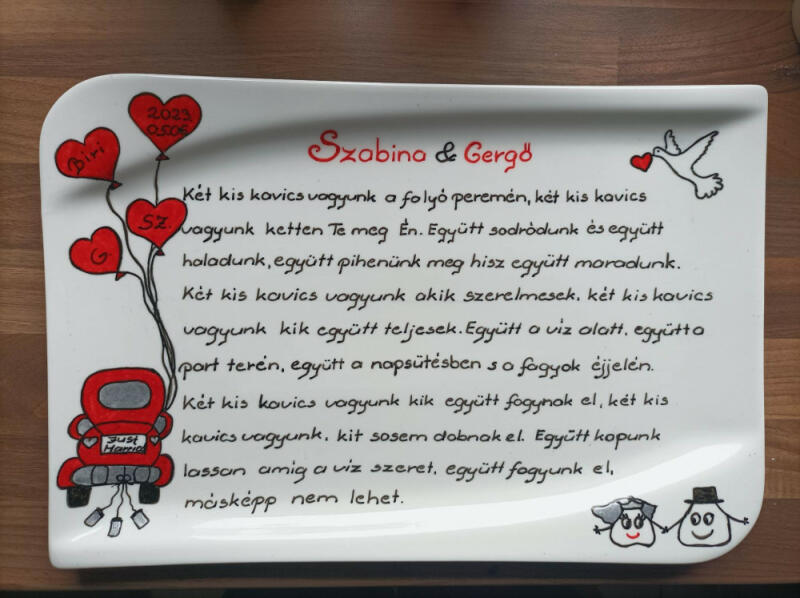 Egyedi kínáló tál esküvőre, 40 cm Ha nincs ötleted mit adj az Ifjú párnak, ez a kínáló tál biztosan nagy örömet szerez majd, amiről mindig eszükbe fog jutni kitől kapták. Egyedi elképzelést is szívesen megvalósítok, a névre, feliratra mintára vonatkozó kéréseidet a megjegyzés rovatban tudod feltüntetni. A termék egészségre ártalmatlan porcelán festékkel készü