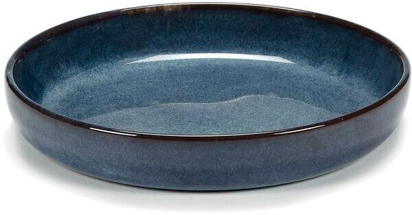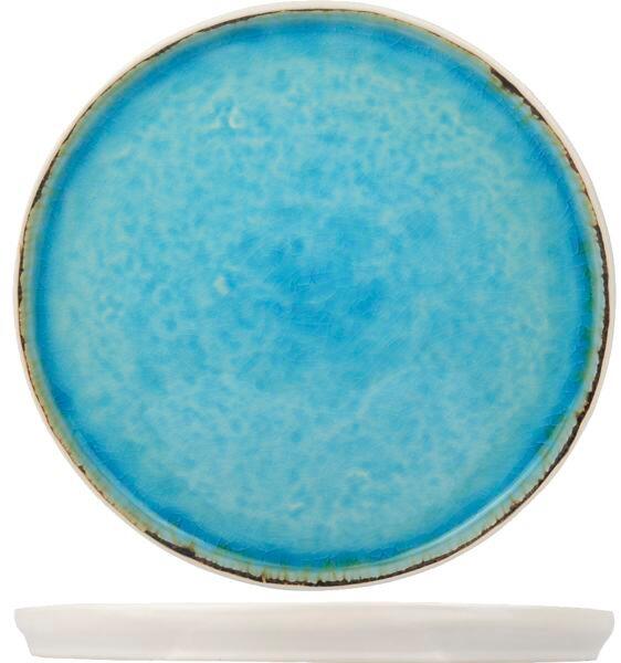 Kerámia sekély tányér 21,5 cm átmérővel. A belső része kék, a külső fehér. A zománcnak köszönhetően a tányér szépen csillog. Edények különleges retró stílusú kollekciója nem szabályos formákkal.