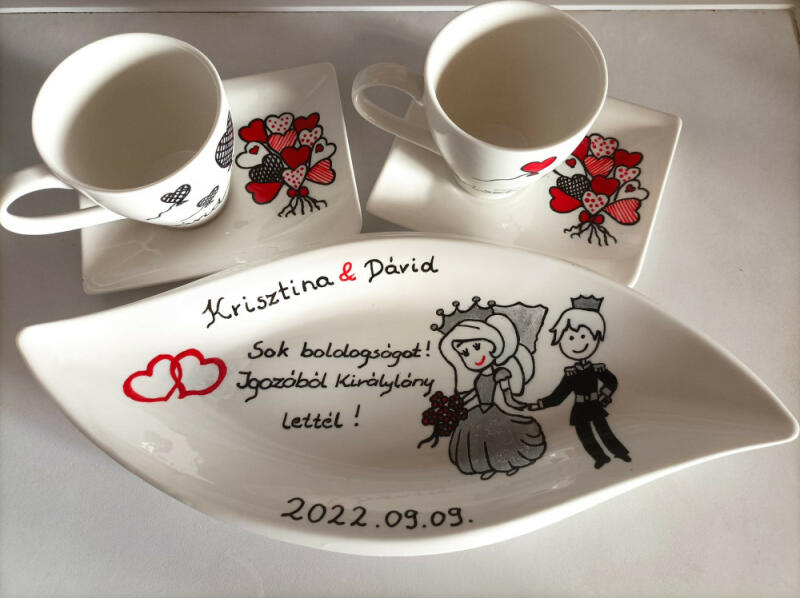 Egyedi kínáló tál esküvőre 2 db presszós szettel Ha nincs ötleted mit adj az Ifjú párnak, ez a kínáló tál biztosan nagy örömet szerez majd, amiről mindig eszükbe fog jutni kitől kapták. Ráadásul 2 presszós szett is az ajándék része, melyben átadhatod a nekik szént pénzt is. A névre, feliratra mintára vonatkozó kéréseidet a megjegyzés rovatban tudod feltüntetni.