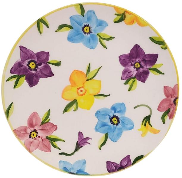 Termék adatai Reggelizős festett tányér Árvácska Anyaga: kerámia Szín:Máz alatti festék, 1030C-on égetett mázzal bevonva. Átmérő:19,5 cm Bevonat: Károsanyag mentes, fényes máz. Készült: Égetéssel 1030 C-on Minden egyes darab egyedileg, kézzel készült és kézzel festett, emiatt előfordulhatnak apróbb hibák, amelyek minden darabot még egyedibbé és különlegesebbé te