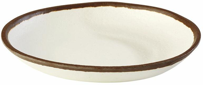 Szerviz- és büfétermékek agyaghatású kivitelben, barna szegéllyel. A felület belül és kívül finoman matt, agyagszerű tapintású. Tartalom: 0,5 l Magasság: 30 mm Ø: 205 mm Szín: barna, krém Anyag: Melamin (MF)