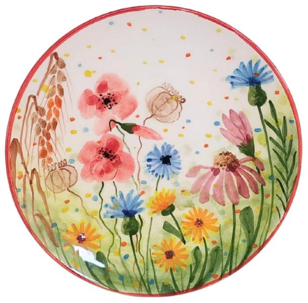 Termék adatai Reggelizős festett tányér Pipacsmező Anyaga: kerámia Szín:Máz alatti festék, 1030C-on égetett mázzal bevonva. Átmérő:19,5 cm Bevonat: Károsanyag mentes, fényes máz. Készült: Égetéssel 1030 C-on Minden egyes darab egyedileg, kézzel készült és kézzel festett, emiatt előfordulhatnak apróbb hibák, amelyek minden darabot még egyedibbé és különlegesebbé t