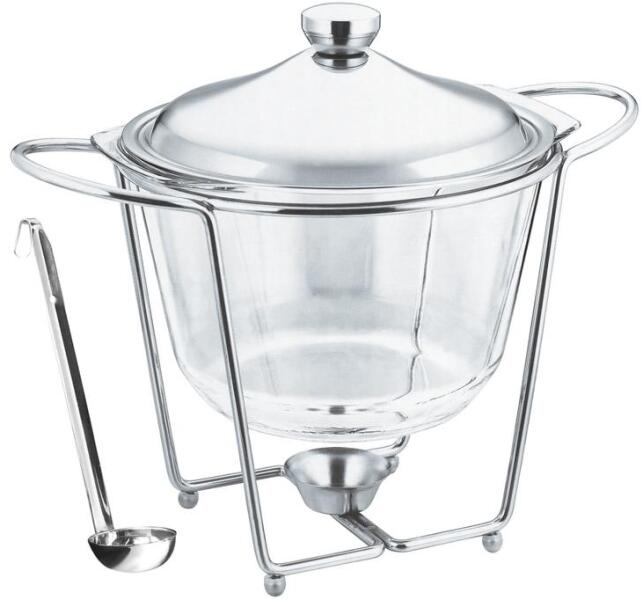 Anyaga: boroszil ikát üveg, krómozott vas, rozsdamentes acél Doboz mérete: 24,5*33*25 cm Tartalma: 1 db tál: 22,5 cm átmérő; 15 cm magas 1 db fedő: 23,5 cm átmérő 1 db merőkanál: ~27 cm hosszú 1 db állvány: 35 cm széles; ~22,5 cm magas Űrtartalma: ~4 l Bruttó súlya: 2,64 kg Nettó súlya: 2,34 kg Tisztítása: Seml eges folyékony mosogatószerrel mossa el! Kerül