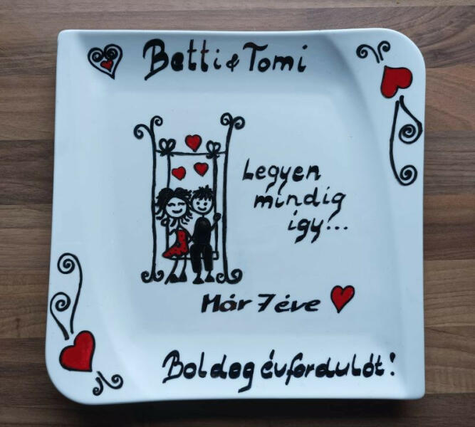 Süteményes tányér évfordulóra, 25 cm átmérőjű Ajándékozz a tortával együtt egyedi sütis/pogácsás tálat. Garantált siker lesz, mivel örök emlék az Ünnepeltnek. Egyedi elképzelést is szívesen megvalósítok, a névre, feliratra mintára vonatkozó kéréseidet a megjegyzés rovatban tudod feltüntetni. A termék egészségre ártalmatlan porcelán festékkel készült, 50 f