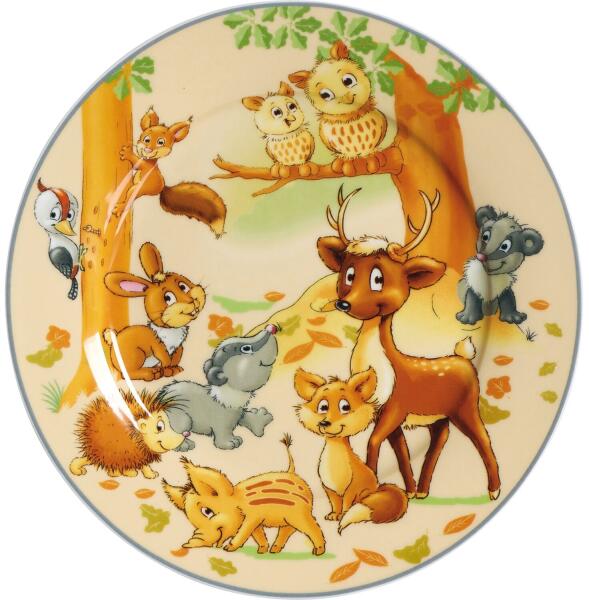 Erdei állatok témájú porcelántányér. Mérete: 19 cm.