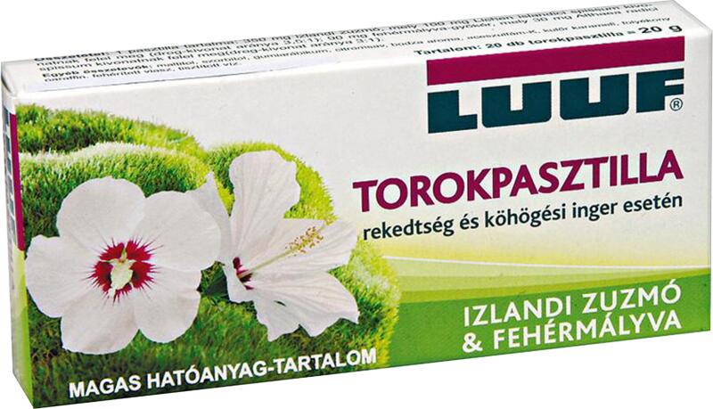 Luuf torokpasztilla rekedtség és köhögési inger esetén. Izlandi zuzmóval és fehérmályvával. Izlandi zuzmóval és fehérmályvával Rekedtség és köhögési inger esetén - Magas hatóanyag tartalom - Kellemes bodza íz - Gyermekeknek és felnőtteknek Összetétel 1 pasztillában: 350mg izlandi zuzmó, mely megfelel 100mg Lichen islandici spissum kivonatnak (drog-kivonat aránya 3,5: