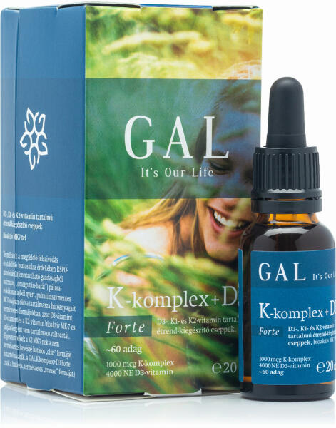 GAL K-komplex + D3 vitamin, 1000 mcg K-komplex + 4000 NE D3 x 60 adag D3-, K1- és K2-vitamin tartalmú étrend-kiegészítő cseppek Bioaktív MK7-tel. Termékünk a megfelelő felszívódás és stabilitás biztosítása érdekében RSPO-minősítésű (fenntartható gazdaságból származó, „orangután-barát) pálma- és kókuszolajból nyert MCT-olajban oldva tartalmazza hatóanyagait term