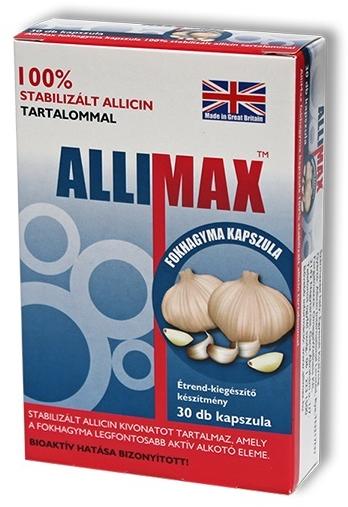 Az Allimax egy prémium minőségű fokhagyma kapszula Angliából. Termékismertető: természetes: nem tartalmaz semmilyen mesterséges anyagot. stabilizált: a termékcsalád tagjai garantáltan tartalmazzák az illékony allicint, melyet Peter Joslingnak sikerült elsőként stabilizált formában megőriznie. bioaktív: a növényekben a fő anyagcsere utak mellett másodlagos anyagcsereterm