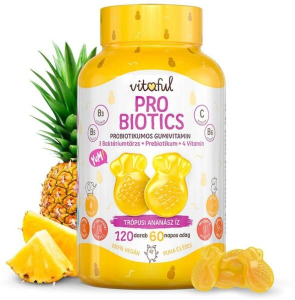 Vitaful Probiotics Probiotikum gumivitaminA Vitaful Probiotics-ot kifejezetten emésztési problémákkal küzdő, aktív, gyakran stresszes életvitelt élő felnőtteknek lett kifejlesztve, célja az ellenálló, egészséges bélflóra és emésztés kialakítása. Egy puha, ananász ízű nasi, ami olyan finom, hogy valószínűleg a kedvenced lesz. Trópusi ananász íz, puha, természetes gu