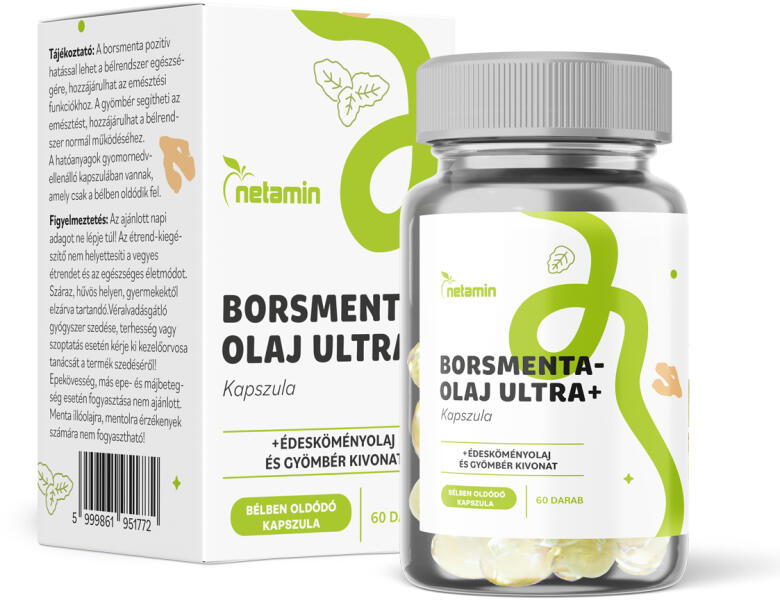 Netamin Borsmentaolaj ULTRA+ kapszula 60 kapszula. Borsmentaolaj, édesköményolaj és gyömbér kivonat kombinációja. Ideális választás:Ha rendetlenkedik az emésztésed, puffadsz, görcsölsz, gázzal van tele a hasad, esetleg hasmenésed és/vagy székrekedésed van IBS, SIBO, vagy IBD (gyulladásos bélbetegség) eseténA borsmentaolaj pozitív hatással van a bélrendszer egészségére