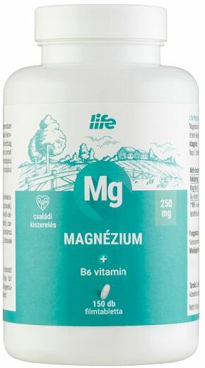 LIFE MAGNÉZIUM+B6 VITAMIN FILMTABLETTA 150DBLife Magnézium + B6-vitamint tartalmazó étrend-kiegészítő készítmény hozzájárul az idegrendszer megfelelő működéséhez és a normál pszichológiai funkciók fenntartásához. A magnézium és a B6 -vitamin hozzájárul a fáradság és a kifáradás csökkentéséhez. A magnézium részt vesz a normál csontozat és fogazat fenntartásá