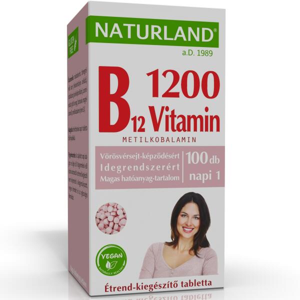 NATURLAND B12-VITAMIN 1200 g 100DB Tablettánként 1200 g hatóanyagot tartalmazó B-12 vitamin készítmény. A B12-vitamin hozzájárul a normál vörösvérsejt-képződéshez, az idegrendszer megfelelő működéséhez, a normál pszichológiai funkció fenntartásához, a fáradtság és kifáradás csökkentéséhez és részt vesz a normál energiatermelő anyagcsere-folyamatokban is. A B12