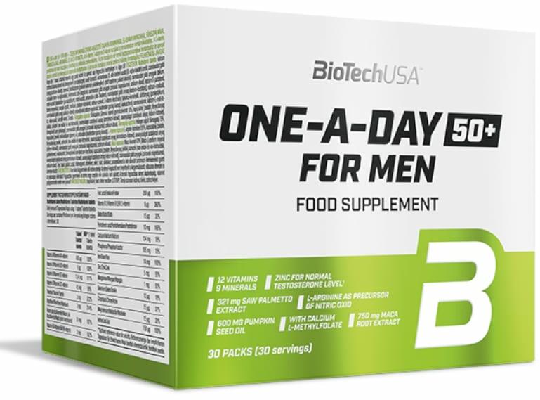 BioTechUSA One a day 50+ for men 30 csomag leírás BioTechUSA One a day 50+ for men 30 pack. Többkomponensű étrend-kiegészítő tasakok vitaminokkal és ásványi anyagokkal, fűrészpálmával, tökmagolajjal, l-argininnel és maca kivonattal Miért ajánljuk a One-A-Day 50+ For Men vitamincsomagot? Komplex, válogatott összetétel férfiaknak Cinkkel, ami hozzájárul a vér normál teszto
