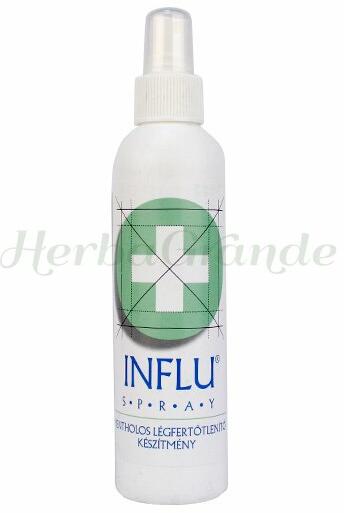 Influ Spray csak gyógynövény kivonatot tartalmazó légfrissítő, légfertőtlenítő készítmény. A cseppfertőzéssel terjedő betegségek ellen nyújt hatékony megelőzési lehetőséget. Természetes menta és eukaliptusz illóolajat, illetve fertőtlenítőszert tartalmazó készítmény. A tartalmazott illóolajának a népgyógyászat régóta légzéskönnyítő, illetve légúttisz