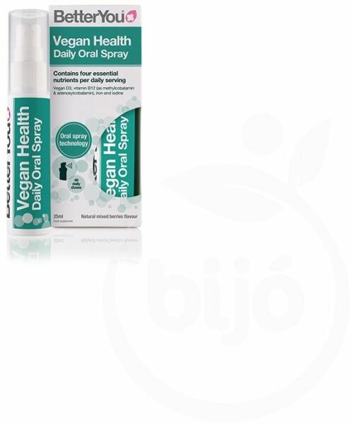 FONTOS TÁPANYAGOK VEGÁNOKNAK A BetterYou Vegan Health szájspray olyan tápanyagok kombinációját tartalmazza, melyeket a vegán életmód támogatására állítottak össze, beleértve a vegán D3-at, a B12-vitamint, a vasat és a jódot. GluténmentesVegánGMO-mentes Vegán D3-vitamint, B12-vitamint, vasat és jódot tartalmaz A vegán és vegetáriánus étrendben alulreprezentált tápany