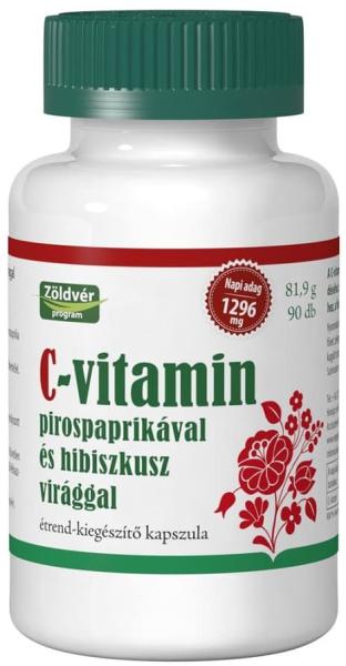 ZÖLDVÉR C-VITAMIN PIROSPAPRIKÁVAL ÉS HIBISZKUSZ VIRÁGGAL KAPSZULA 90DBC-vitamin (l-aszkorbinsav), pirospaprika, hibiszkuszvirág 1296 mg C-vitamin a napi adagban! A C-vitamin hozzájárul az immunrendszer normál működéséhez, a sejtek oxidatív stresszel szembeni védelméhez, a fáradtság és a kifáradás csökkentéséhez. Napi 3×1 kapszula bő folyadékbevitellel. Száraz, hűvös h