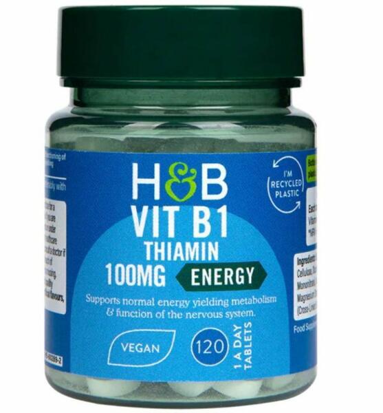 H&B b1-vitamin tabletta 396mg 120 db ?100 mg tiamint (B1-vitamin) tartalmaz ?támogatja az idegrendszer normál működését és az energiatermelést ?hozzájárul a szív egészségéhez ??vegán Tiamin más néven B-1 vitamin, amely vízben oldódó vitamin. Elősegíti a normál idegrendszer működését és az energiatermelő anyagcserét. 100mg tiamint tartalmaz, amely hozzájárul a sz