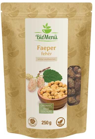 Biomenü Bio faeper fehér – 250g Mind a fehér, mind a vörös és a fekete gyümölcs gazdag fenolforrás, ezáltal jótékonyan hatnak a szívműködésre, az érrendszerre. Az édes és tápláló fehér faeper tele van vitaminokkal és ásványi anyagokkal, fogyasztásával javulhat az egész szervezet vérkeringése. Biomenü Bio faeper fehér – 250g Az édes és tápláló fehér faeper