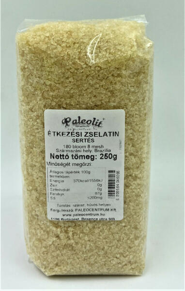 Paleolit Étkezési Zselatin /sertés/ 250 g Közepes bloomszámú sertésbőr zselatin (180 bloom, 8 mesh). A zselatin 5-szörös mennyiségű vizet képes felvenni. A legelterjedtebb zselésítő anyag, ezért élelmiszerekben és gyógyszerekben széles körben alkalmazzák. Állati eredete miatt a vegetáriánus élelmiszerekben, valamint egyes vallási előirányzatok miatt (kóser, halal), p