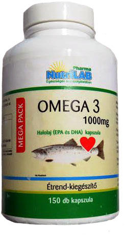 NutriLABOMEGA3Forte1000 mg 150x Norvég minőség Magasan koncentrált halolaj (EPA és DHA) étrend-kiegészítő kapszula Az EPA és DHA hozzájárul a szív megfelelő működéséhez. A kedvező hatás 250mg EPA és DHA napi bevitelével érhető el. Napi adag 1 kapszula NRV* Halolaj Ebből: EPA (40%) DHA (20%) E-vitamin 1000 mg 400 mg 200 mg 6 mg 50% (napi E-vitamin bevitelnek) NRV *Ajánlott