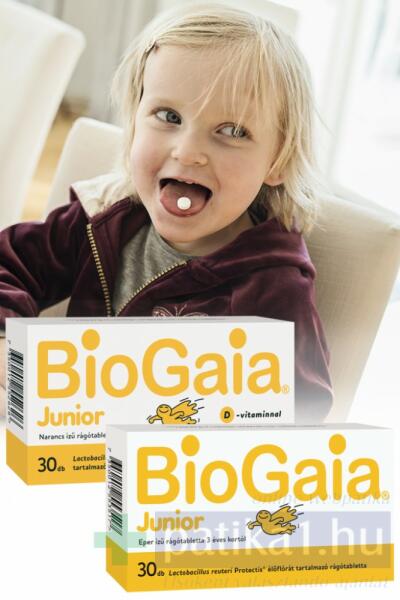 Étrend-kiegészítő rágótabletta édesítőszerrel. 3 éves kortól ajánlható , eper és narancs ízben, 10 és 30 darabos kiszerelésben. Miért jó? A BioGaia Junior rágótabletta egy, a BioGaia által szabadalmaztatott baktériumtörzset, Lactobacillus reuteri Protectis®-t* tartalmaz, mely humán eredetű, anyatejből izolálták, és természetes élettere az emberi szervezet. Bővebb
