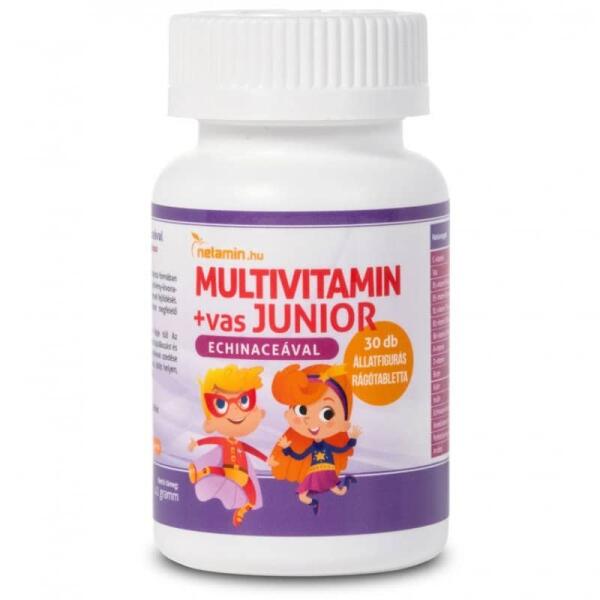 NETAMIN MULTIVITAMIN +VAS JUNIOR RÁGÓTABLETTA ECHINACEÁVAL 30DBA Netamin Multivitamin+vas JUNIOR rágótabletta komplex összetételének köszönhetően 4 éves kortól biztosítja a gyermekeknek mindazt, amire az egészséges fejlődéshez szükségük van. A Netamin Multivitamin+vas JUNIOR beadásával még az ételeink egyre csökkenő tápanyagtartalma, az őszi-téli időszak alacsonyabb