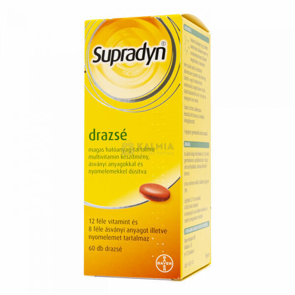 Gyártó: Modell: Supradyn Drazsé - 60db Leírás: Supradyn drazsé 60x A Supradyn drazsét az általános vitaminhiány megelőzésére és kezelésére alkalmazzák. A Supradyn drazsét fokozott vitamin- és ásványianyag-szükséglet idején, különösen betegségek, megnövekedett igénybevétel alatt kell szedni. Ha az orvos másképp nem rendeli, szokásos adagja felnőtteknek és 12 év