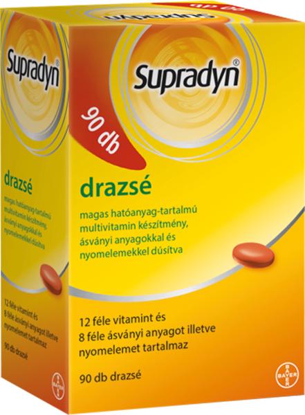 Gyártó: Supradyn Modell: Drazsé 90db Leírás: A vitamin-mennyiségeket az Európa Tanács és az USA Nemzeti Kutatási Tanács által javasolt NRV (ajánlott napi bevitel) alapján határozták meg. A vitaminok létfontosságú anyagok. Nélkülözhetetlenek a szénhidrátok-, az energia-, a lipidek-, a nukleinsavak és a fehérjék metabolizmusában, valamint az aminosavak, a kollagén és a
