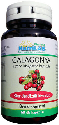 NutriLAB GALAGONYA kivonat étrend-kiegészítő kapszulaStandardizált kivonat ÖsszetevőkNapi adag1 kapszulaGalagonya levél kivonat (Crataegus Pinnatifida) 1,8% vitexinre standardizált (HPLC)300 mg Összetevők: Galagonya kivonat, kukoricakeményítő, hidroxi-propil-metil-cellulóz (kapszula)Tartalom: 60 kapszulaAjánlott napi mennyiség:Naponta 1 kapszula GALAGONYA fogyasztása ajánlott. N