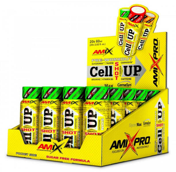 EDZÉS ELŐTTI KIEGÉSZÍTŐ Egyedülálló, szuperkoncentrált edzés előtti étrend-kiegészítő kisméretű shot formában. Az Amix CellUp® szabadalmaztatott, magas koncentrációjú porított glicerint és szilícium-dioxidot, valamint CarnoSyn® béta-alanint, taurint, L-arginin HCl-t, N-acetil-L-tirozint, koffeint és B6-vitamint tartalmaz C-vitaminnal. A GlyceroMax® a porított glicerin