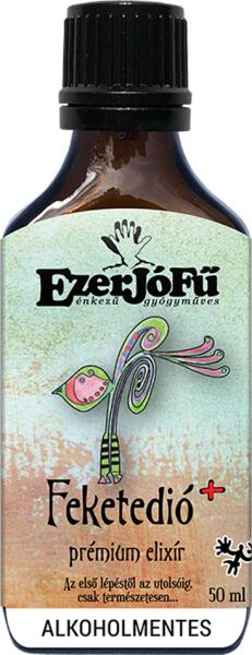 Az EzerJóFű Feketedió+ prémium elixír egy 50 ml-es alkoholmentes gyógynövény kivonat, amely elősegíti a gyomor, bél és emésztőrendszer egészségét. Fő összetevői között szerepel a feketedió terméshéj, fehér üröm, szegfűszeg és cayenne, használata pedig napi 3×20-40 csepp étkezések előtt fél órával ajánlott. Alkalmazás : 3×20-40 csepp naponta étkezések elő
