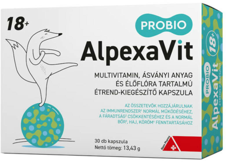 Az AlpexaVit ProBio 18+ multivitamin, ásványi anyag és élőflóra tartalmú étrend-kiegészítő, mely felnőtteknek, 18 éves kortól ajánlott. Az AlpexaVit ProBio 18+ multivitamin, ásványi anyag és élőflóra tartalmú étrend-kiegészítő kapszula, mely felnőtteknek, 18 éves kortól ajánlott. Antibiotikum-kúrával egy időben bevehető, illetve várandós és szoptató anyáknak