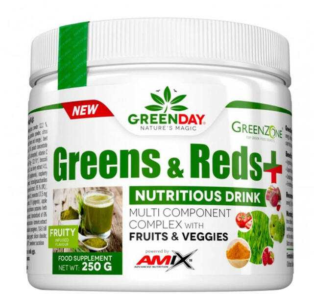 AMIX Nutrition - GreenDay Greens & Reds + Fruity 250g - Superfood - Zöldségpor Az AMIX Nutrition GreenDay® Greens & Reds + Fruity egy komplex szuperélelmiszer-keverék, amely különféle zöld és piros növényi kivonatokat tartalmaz, hogy támogassa az egészséges életmódot és a vitalitást. Ez a 250g-os termék kifejezetten azok számára készült, akik szeretnék növelni nap
