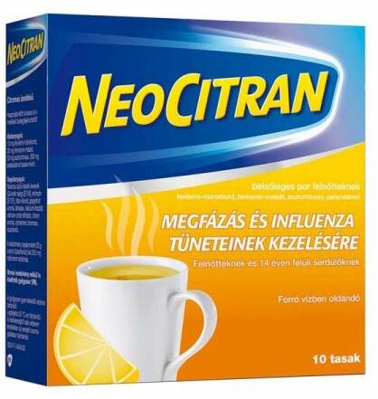 Gyártó: Modell: Neo Citran belsőleges por felnőtteknek 10 db Leírás: A Neo Citran belsőleges por felnőtteknek négy hatóanyagot tartalmaz, amelyek a megfázás és az influenza tüneteire hatnak: a paracetamol fájdalom és lázcsillapító (láz esetén csökkenti a testhőmérsékletet), a fenilefrin enyhíti az orrdugulást, a feniramin-maleát egy antihisztamin, az allergia tüneteine