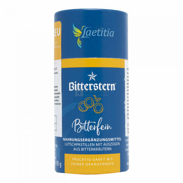 Bitterstern bitterfein étrend-kiegészítő pasztillák aromás keserű gyógynövények kivonataival 90 db A keserű anyagok révén étvágycsökkentés, méregtelenítés, édesség fogyasztásának csökkenése, jó közérzet megteremtése, zsíros ételek semlegesítése, májfunkciók-, emésztés segítése. A keserű anyagok fogyasztása jobb immunrendszert eredményez, serkentik az emé