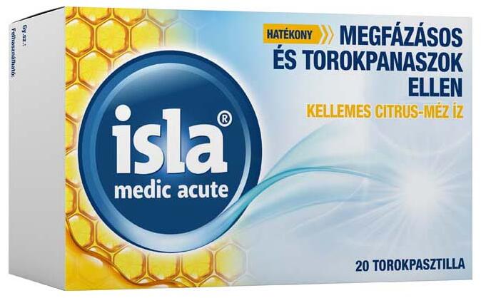 A citrus-méz ízesítésű Isla® Medic Acute a megfázásos tünetek és torokpanaszok kezelésére nyújt hatékony megoldást. A hidrogél komplexnek köszönhetően védi a száj és a torok nyálkahártyáját, mely izlandi zuzmó tartalmú torokpasztilla már 6 éves kortól adható. A megfázás és torokfájás tipikus tüneteinek enyhítésére mint a torokirritáció és rekedtség. A n