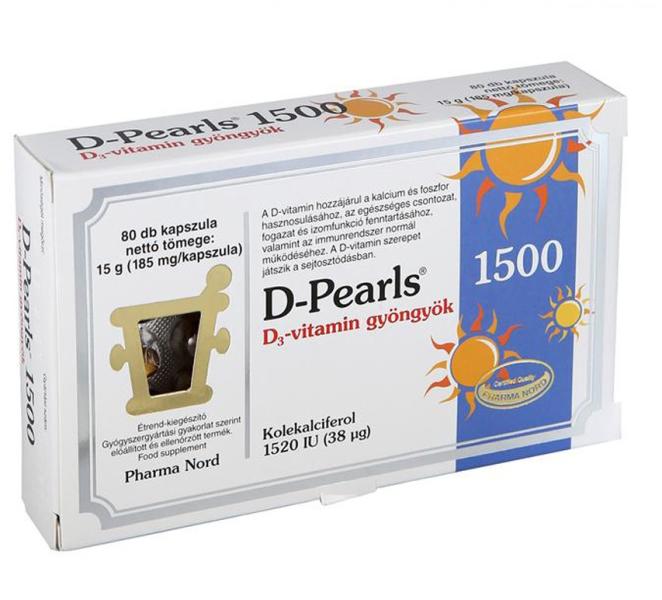 A D-Pearls D-vitamin gyöngyök 38 μg D3-vitamint tartalmaznak kapszulánként. D-Pearls D3 Vitamin 1500 Gyöngykapszula (80 db)38 g D3-vitamin az egészséges csontokért és fogakért A D-vitamin fontos a kalcium felszívódásához Támogatja a normális sejtosztódást A kis gyöngyök 38 g D3 vitamint tartalmaznak. Mivel a D-vitamin zsírban oldódik, kiváló a felszívódása. Dán gyógys