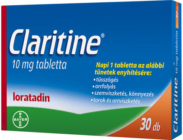 Napi 1 tabletta 24 órás hatással a - mintegy 200-féle allergén által okozott - szénanátha, házipor és állatszőr okozta allergia tüneteire (tüsszögés, orrfolyás, orrviszketés, könnyezés, szemviszketés, torokkaparás), valamint csalánkiütés esetére. A Claritine 10 mg tabletta vény nélkül kapható gyógyszer. Hatóanyag: loratadin. A Claritine 10 mg tabletta az antihisztam