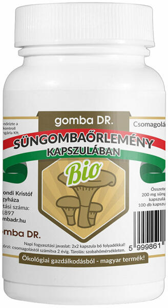 Magyar termelői bio gazdálkodásból származó gombából készült!_x000D_ _x000D_ 1 doboz tartalma: 200 mg (100 % magyar bio termesztett gombaőrlemény)/ zselatin – 100 db_x000D_ A fogyasztási javaslat: Napi 2×2 db étkezés előtt bő folyadékkal. _x000D_ HU-ÖKO-01_x000D_ _x000D_ Ellenőrzi a Biokontroll Hungária Nonprofit Kft. _x000D_ _x000D_ Süngombáról: (Hericium Erinaceus) a t