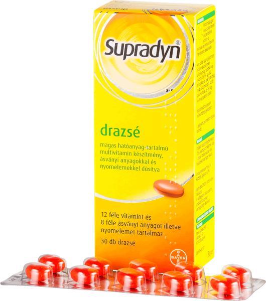Magas hatóanyag tartalmú multivitamin készítmény 12 féle vitaminnal és 8 féle ásványi anyaggal, illetve nyomelemmel, a szervezet megfelelő mikrotápanyag-ellátottságáért a vitaminhiány megelőzésére és kezelésére. A Supradyn drazsé vény nélkül kapható gyógyszer. Forgalmazza: Bayer Hungária Kft. 1117 Budapest, Dombóvári út 26. CH-20230814-46 A KOCKÁZATOKRÓL ÉS MELL